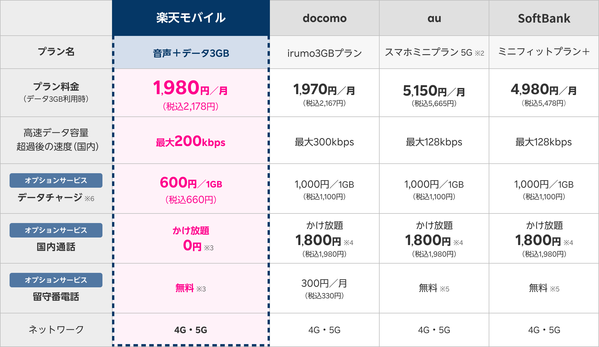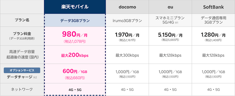 ここからは、楽天モバイルの法人プランと他社プランの比較をしていきます。