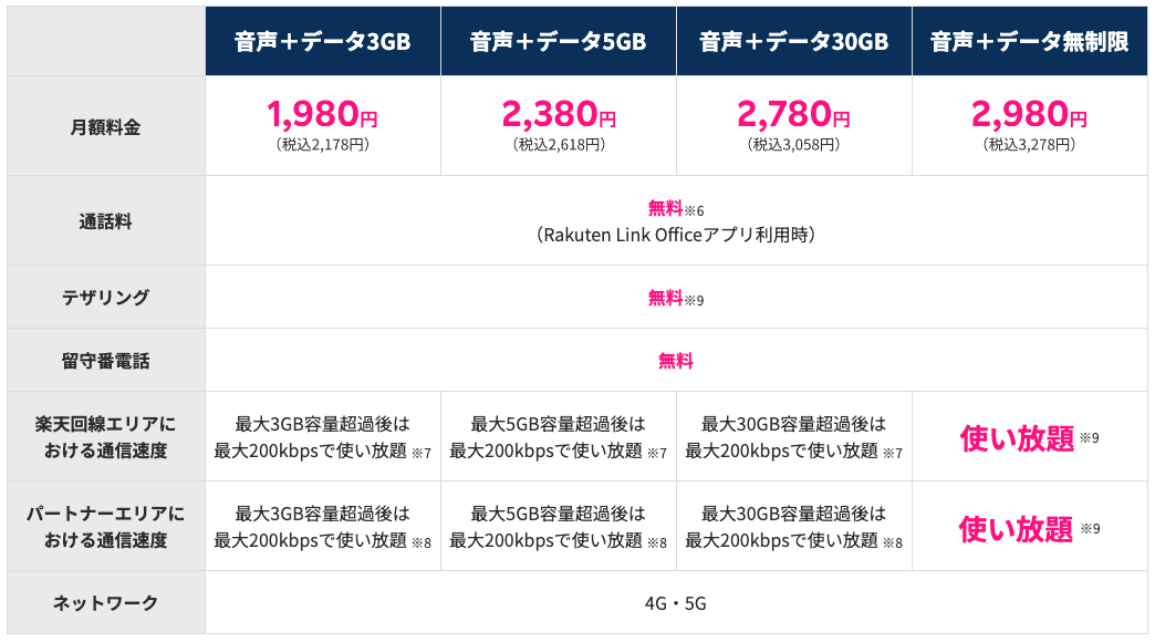 ・個人プラン:「Rakuten Link」アプリを使えば国内通話が無料です。