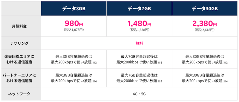 楽天モバイル法人プランと個人向けプランのデータプランも異なります。法人プランでは容量ごとの3プランや段階制の1プランが用意されていますが、個人向けプランでは3GBまでのプランが1,078円、20GBまでのプランが2,178円、無制限のプランが3,278円です。
