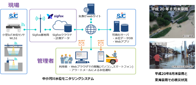 愛知県岡崎市の岡崎市総合雨水対策計画における浸水被害を防ぐ内水氾濫対策として、効率的かつ効果的な河川・下水道整備に向け重要な用排水路の面的なリアルタイム水位監視を行う「中小河川水位モニタリングシステム」にSigfoxが活用されています。