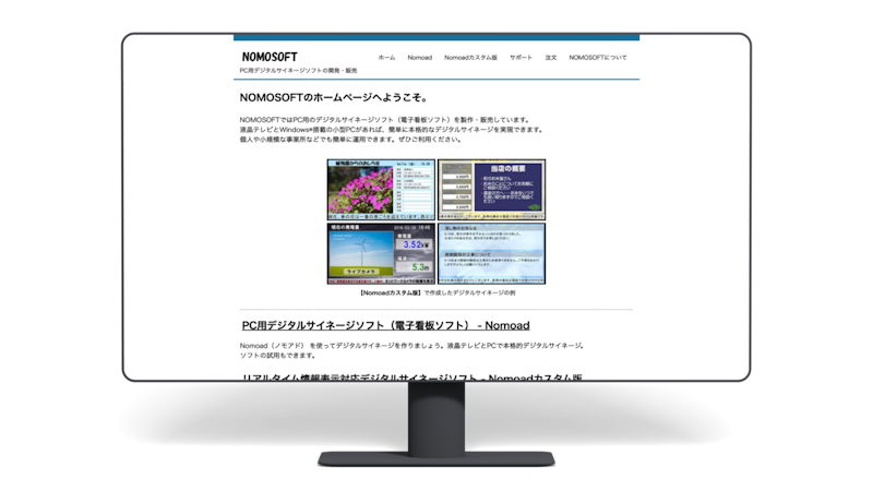 Nomoadは、NOMOSOFT合同会社が提供するデジタルサイネージソフトで、主に小規模事業者や個人事業主向けに設計されています。このインストール型のデジタルサイネージソフトは、手軽な操作性が特長で、特にWindows用のソフトウェアとして提供されており、ネットワークにも対応しています。