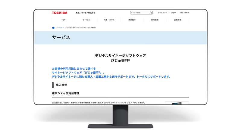びじゅ衛門の特長には、利用用途に合わせて選べるシリーズタイプ、充実したヘルプデスクによるサポート体制、業種や業界に応じたカスタムコンテンツの作成が挙げられます。東芝ITサービス株式会社のネットワークセキュリティサービスのノウハウを結集した「びじゅ衛門」は、使い勝手の良さとリーズナブルな価格が魅力であり、全国の支店で同時に同じコンテンツを表示することも可能です。