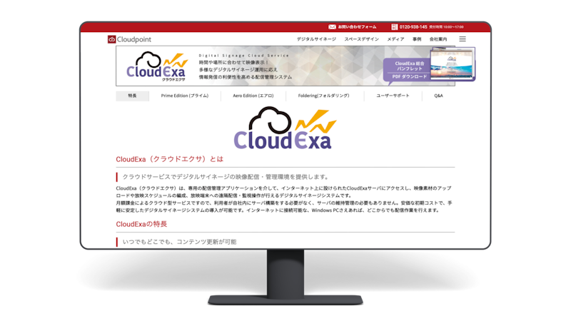 CloudExa(クラウドエクサ)は、株式会社クラウドポイントが提供するクラウド型デジタルサイネージソフトで、その優れた特長が際立っています。このデジタルサイネージシステムは映像配信を主軸とし、即時配信機能や柔軟なコンテンツ管理機能が魅力的です。