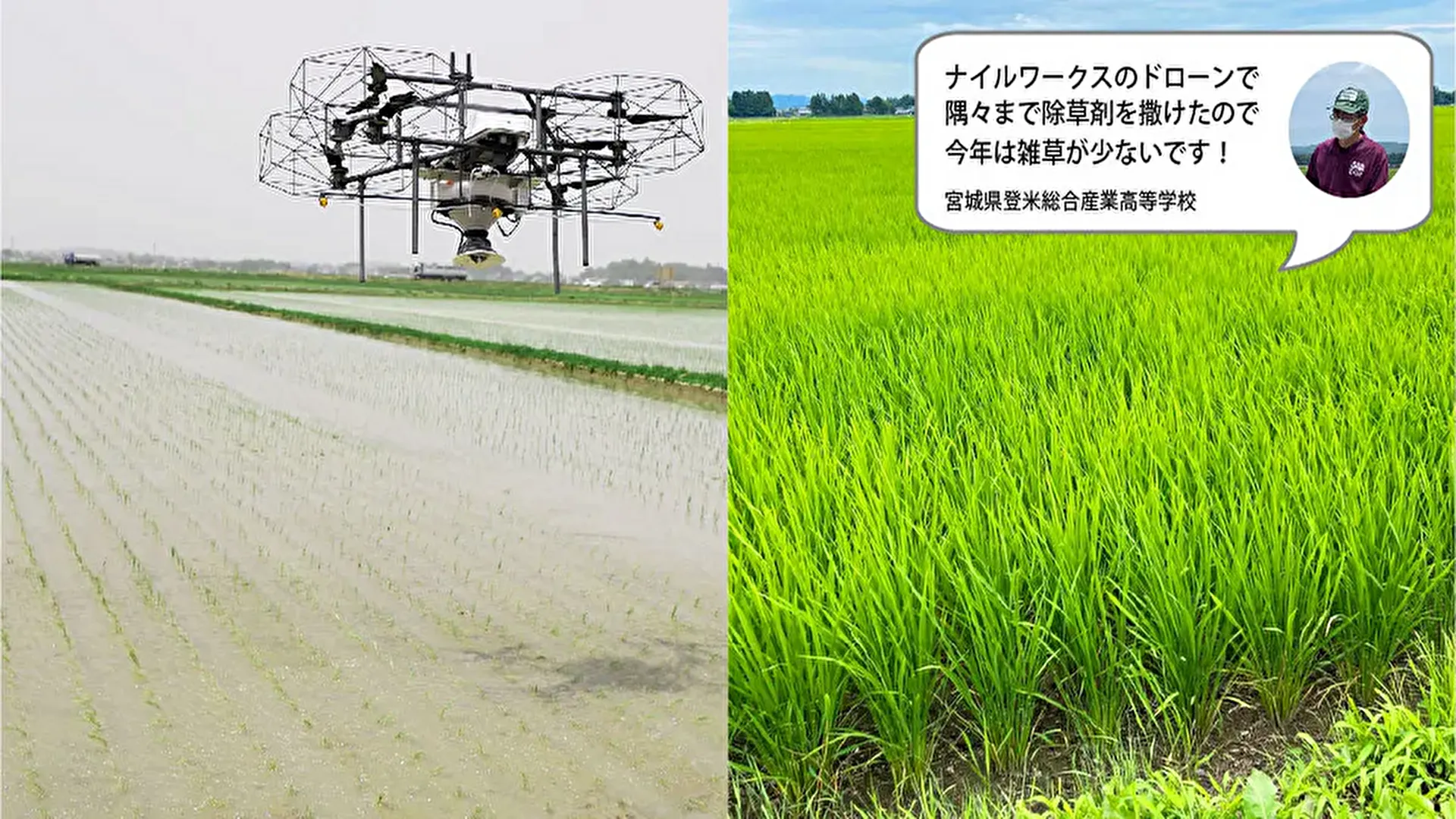 株式会社ナイルワークスは、宮城県登米総合産業高等学校(以下「登米総合産業高校」)の授業で、ドローンによる除草剤や追肥の散布を行いました。