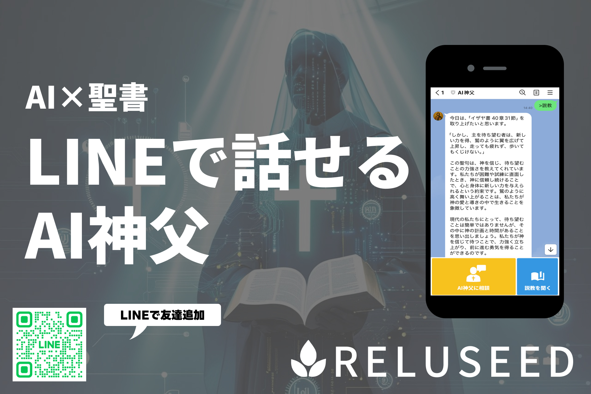 2025年7月22日から、株式会社レルシードが提供開始した、対話型信仰支援AI「AI神父」。「AI神父」は、キリスト教聖書の内容をAIに学習させ、メッセージアプリ「LINE」を通して聖書を交えた対話が可能となったシステムです。