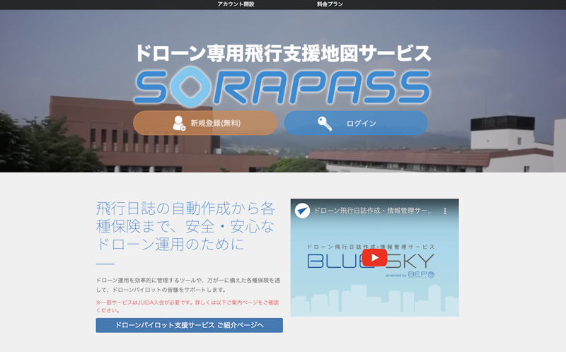 ドローン専用飛行支援サービス「SORAPASS」のウェブサイトにアクセスし、アカウント登録(無料)を行うことで利用可能です。