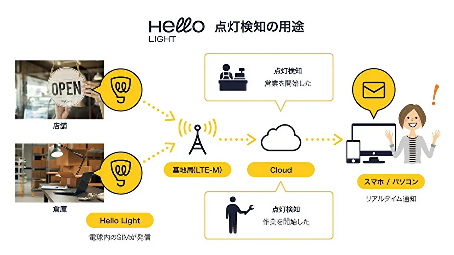「Hello Light」は、LEDにSIMを搭載しており、Wi-Fiなどのネットワークの環境が不要で点灯検知ができるIoT電球です。工事やコンセントも不要で、遠く離れた場所でも電子メールなどを通じて点灯状況をリアルタイムで知ることができます。これまで、高齢者向けの見守りサービス*1として、自治体や不動産業者、介護事業者を中心に、2024年5月時点で約4万個の導入実績があります。