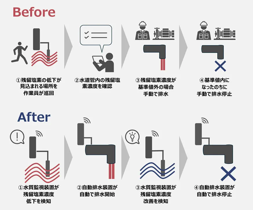 今回追加された自動排水機能は、水道管内の残留塩素濃度をリアルタイムで監視し、必要に応じて自動的に排水を開始・停止するシステムです。これにより、手動での排水作業が不要になり、作業員の現場対応工数を大幅に削減します。特に、人手不足が深刻な水道事業者にとって、労力を削減しながら安全な水供給を確保するための強力なツールとなります。