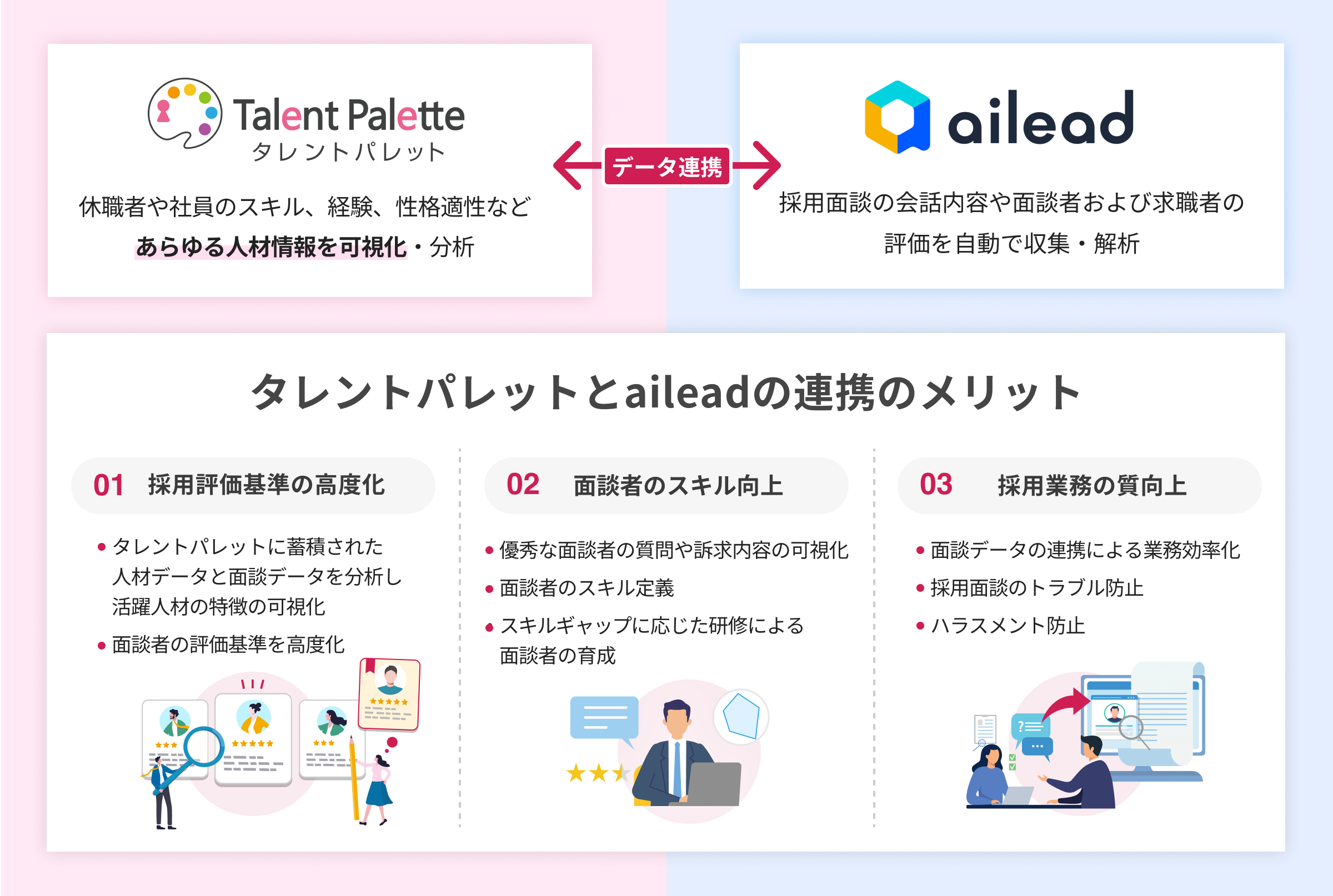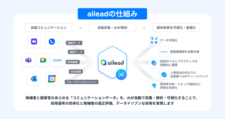この新機能は、商談・面談解析クラウド「ailead(エーアイリード)」とのデータ連携により実現されたものです。採用面談における会話内容を自動で要約し、面談者による求職者の評価内容をAIが解析・可視化することで、属人的になりがちな評価基準を標準化し、採用業務の精度向上に貢献します。