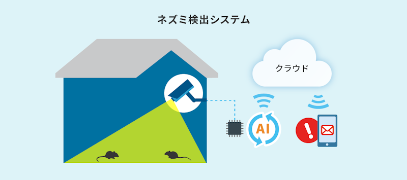 このシステムは、倉庫などネズミなどの害獣が発生する環境にエッジAIデバイスとカメラを設置し、カメラに映ったネズミの検出と通知をするシステムです。