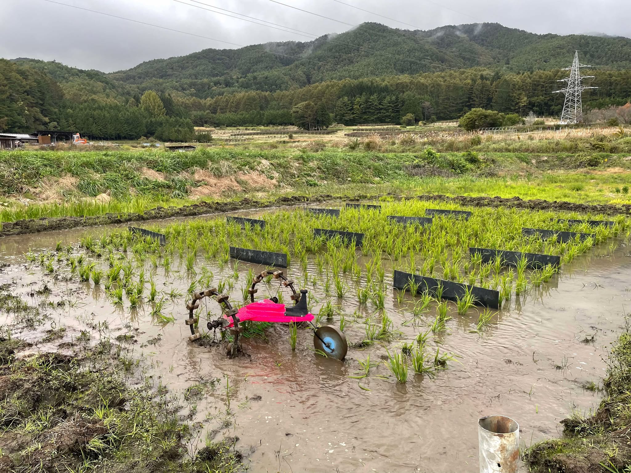 ミズゴールは後継者不足、耕作放棄地といった農業課題を解決するべく長野県で生まれた自動除草ロボットです。自動で水田を走り回り、田んぼの水を濁らせることで、稲の栄養を奪う雑草の光合成を遮り除草できます。