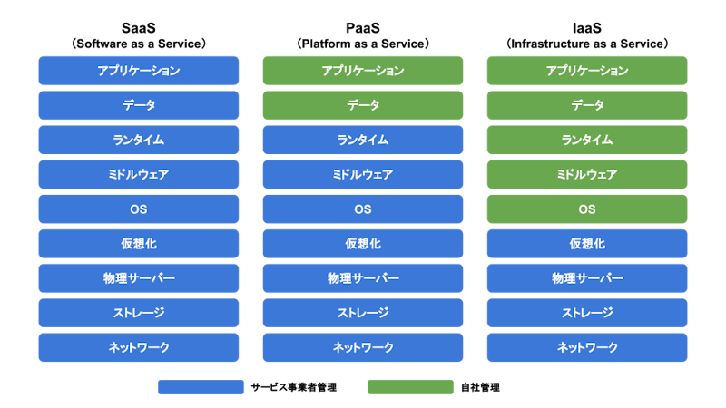 「SaaS」「PaaS」「IaaS(HaaS)」は、それぞれクラウドコンピューティングの種類ですが、サービス事業者が管理する領域なのか、自社が管理する領域なのかというポイントで違いがあります。