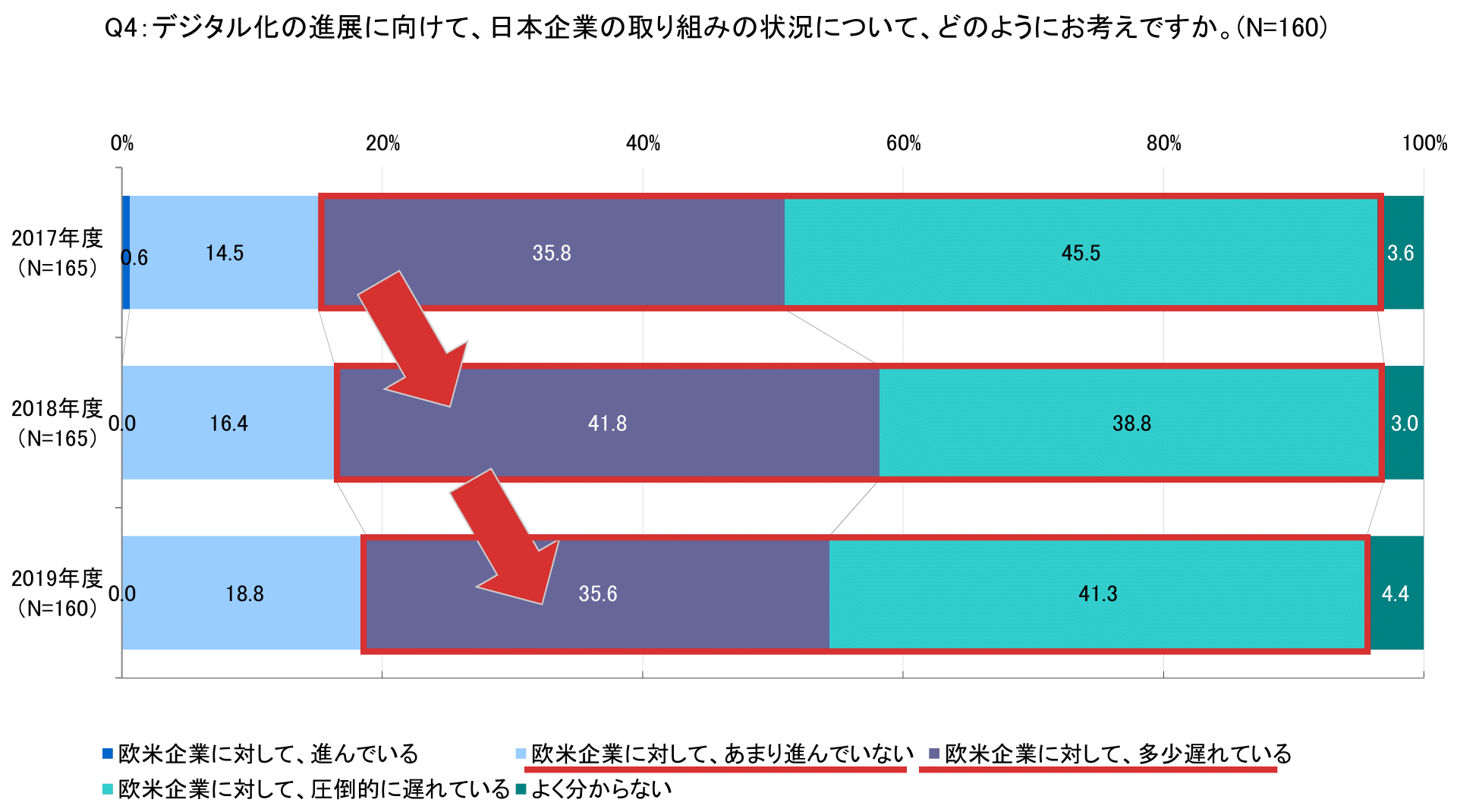また、欧米企業との比較においても、約8割の企業が日本企業のDXが遅れている(「欧米企業に対して、多少遅れている」「欧米企業に対して、圧倒的に遅れている」)と回答しています。