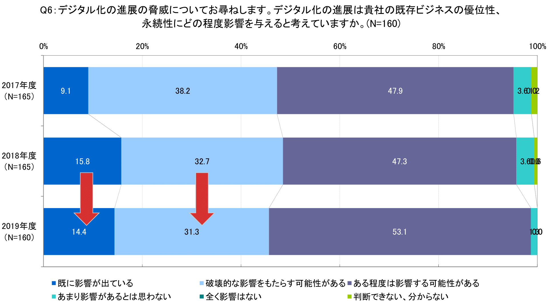 さらに、JUAS(一般社団法人日本情報システム・ユーザー協会)が2020年に発表した『「デジタル化の取り組みに関する調査」デジタルビジネスに関する共同調査<デジタル化はどのように進展しているのか?>』によると、多くの日本企業は、デジタル化の脅威に対する危機感が高まっています。