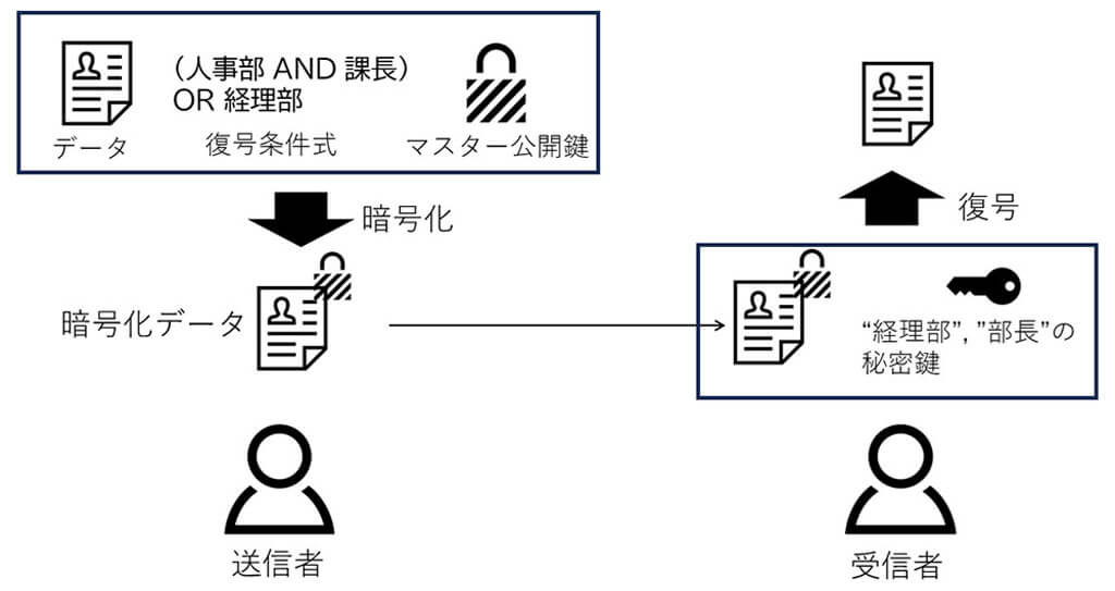 属性ベース暗号(Attribute-Based Encryption, ABE)は、暗号化されたデータに対して「どのような条件を満たす人が復号できるか」を設定できる暗号方式です。例えば、「人事部 AND 課長」や「経理部」など、属性条件を設定し、その条件を満たす人だけがデータを復号可能とする仕組みです。これにより、特定の役職や部署の人々に限定して情報を共有することが可能になり、組織内でのデータアクセスを柔軟に制御できる点が特徴です。
