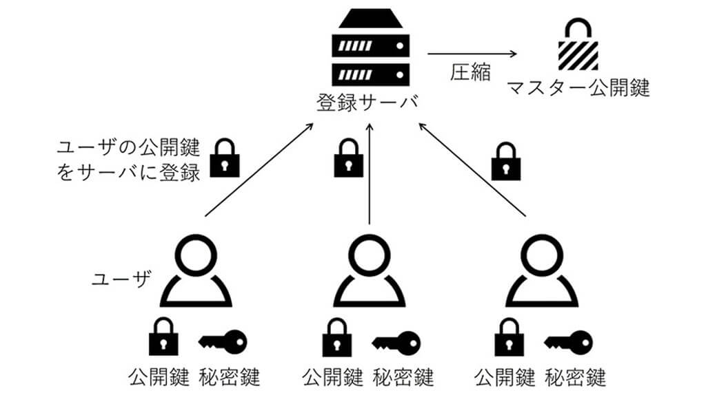 これに対して「登録型属性ベース暗号」が新たに提唱されました。この方式では、鍵生成局がなくなり、各ユーザーが自分自身で秘密鍵と公開鍵を生成します。その後、公開鍵と属性情報を「登録サーバ」に登録します。この登録サーバは、暗号化に必要な「マスター公開鍵」を生成する役割のみを担い、秘密情報は一切保持しません。つまり、登録サーバが攻撃を受けたとしてもシステム全体のセキュリティは保たれます。
