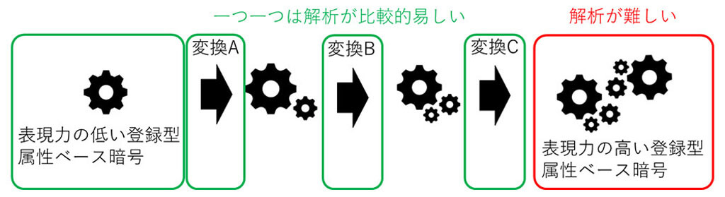 今回、NTTが開発した新しい登録型属性ベース暗号方式は、これら従来の制約を克服し、より実用的なアクセス制御を可能にしました。NTTは、産業技術総合研究所と共著で発表した論文において、解析が容易な要素技術から組み立て式に作るという技法に着目することで、従来の登録型属性ベース暗号における制約を緩和し、より柔軟な条件式を使える暗号方式への変換技術を考案しました。
