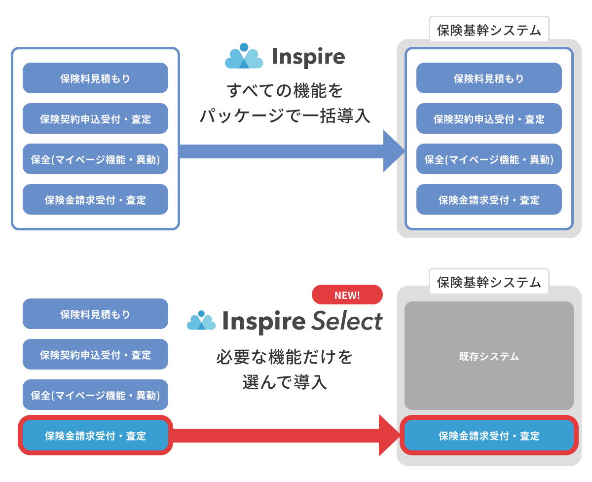 Inspire Selectは一部機能のみを導入できるため従来よりも高速かつ低価格です。既存のシステムに影響を与えることなく完全に独立させて導入可能です。