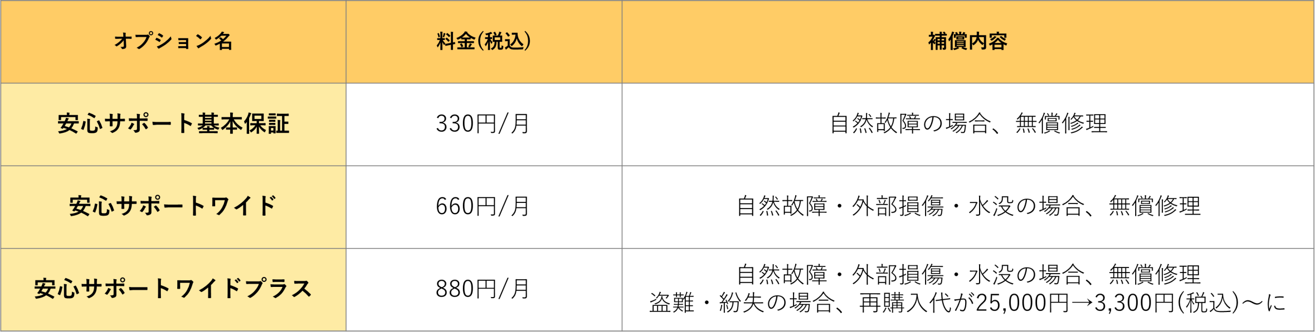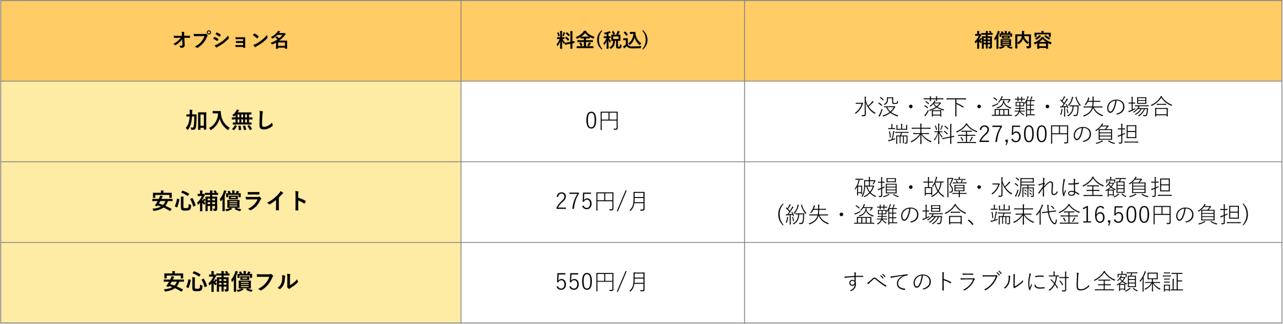 また、補償オプションの具体的な内容は以下の通りです。