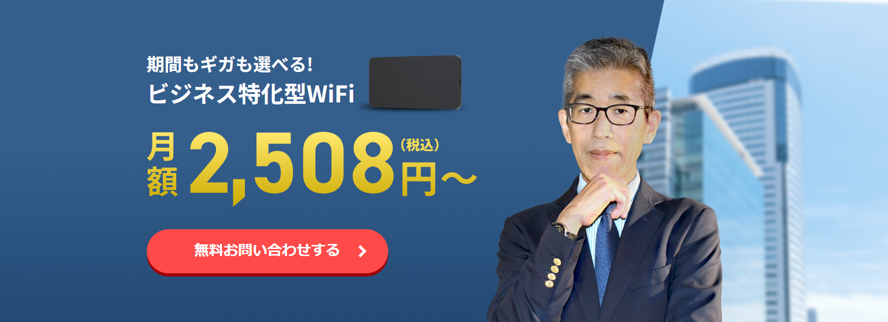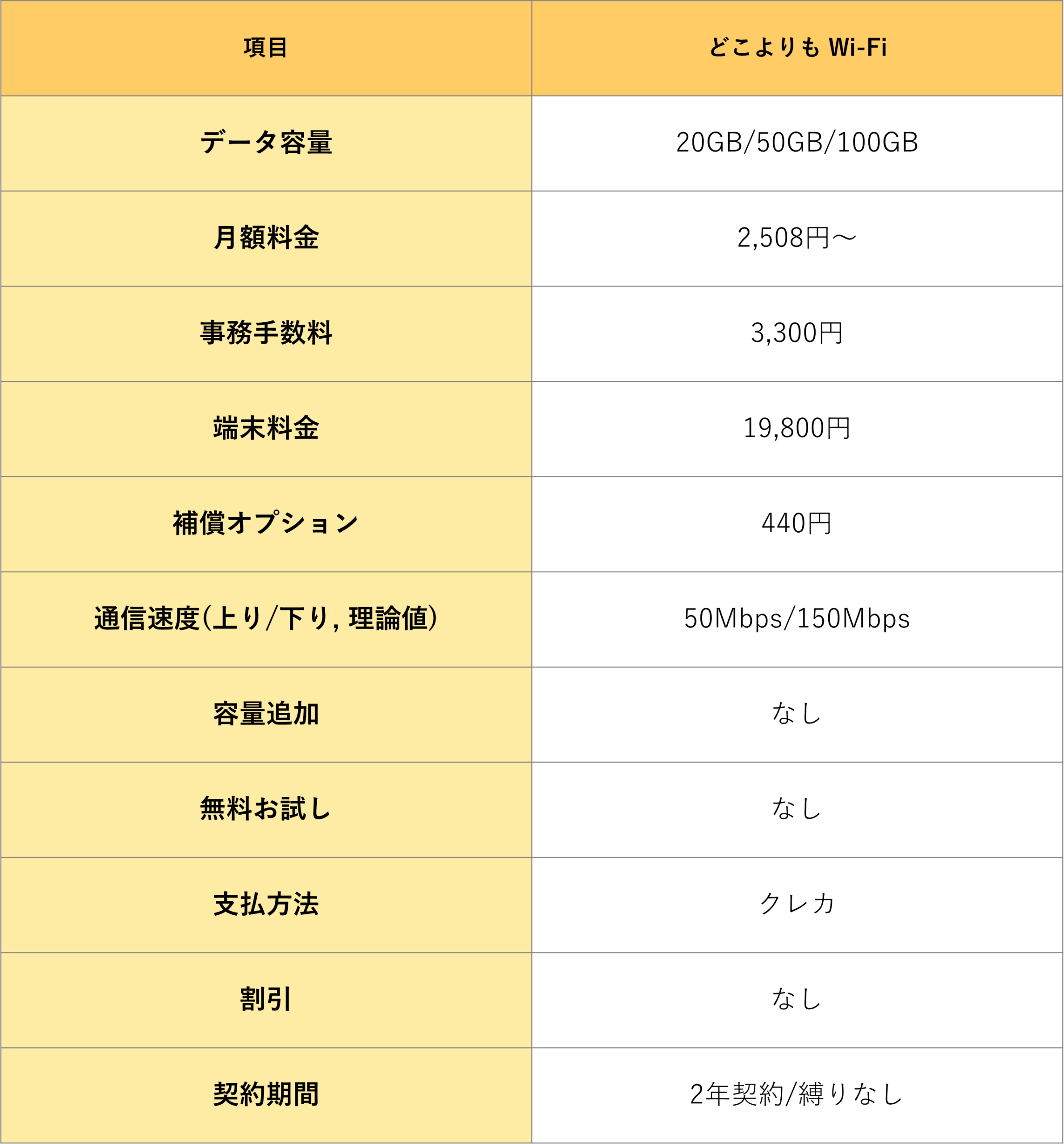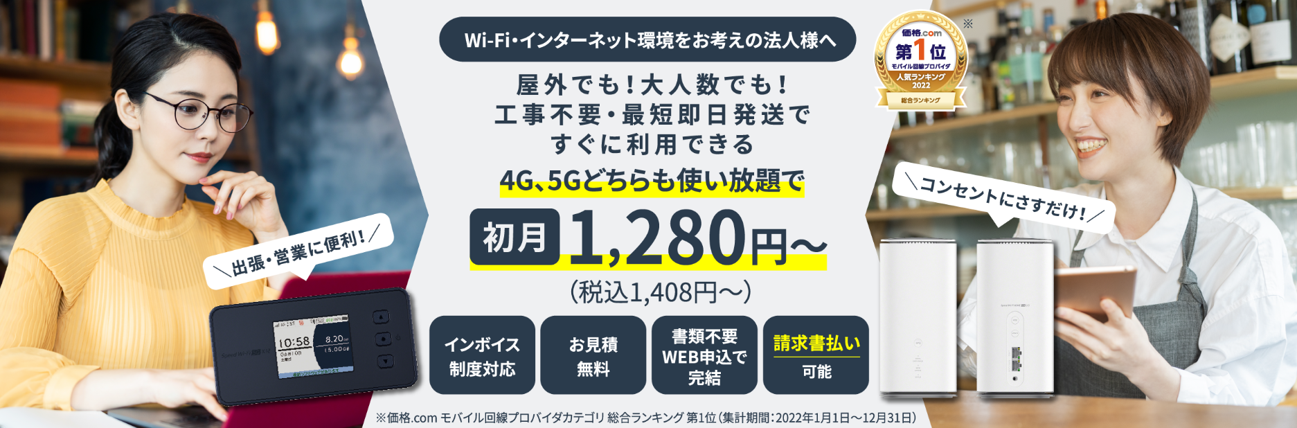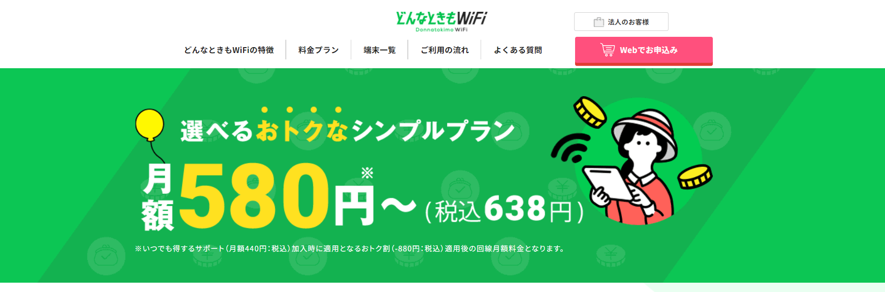 特徴:「どこよりもWi-Fi」は。月額2,508円から利用可能な法人向けポケット型Wi-Fiサービスです。
