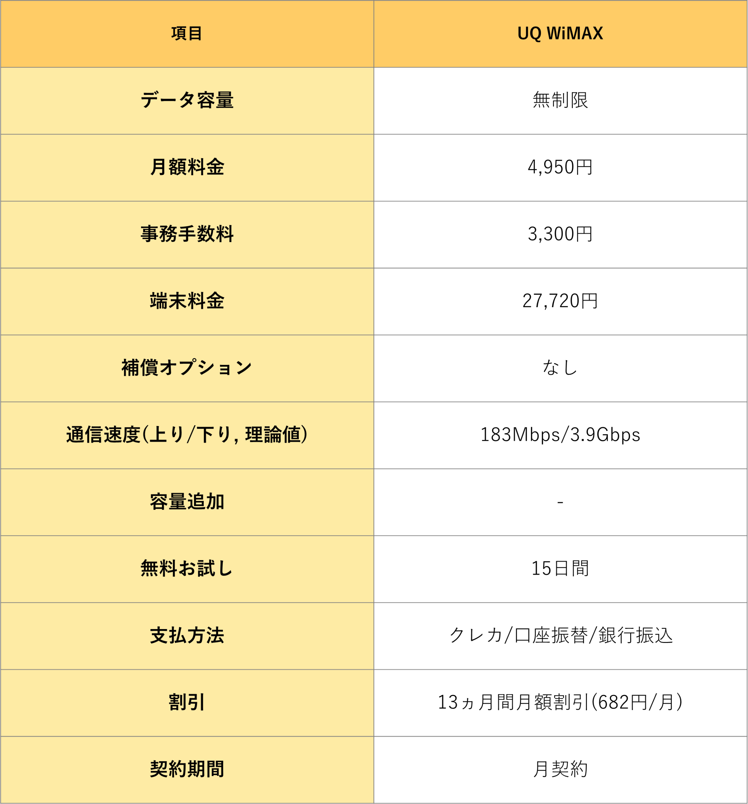 月額料金は他社サービスと比較し多少割高ですが、UQ WiMAXでは15日間の無料お試し期間や、13か月間の月額料金割引(682円/月)を利用可能なため、ある程度お得にサービスを利用することが可能です。
