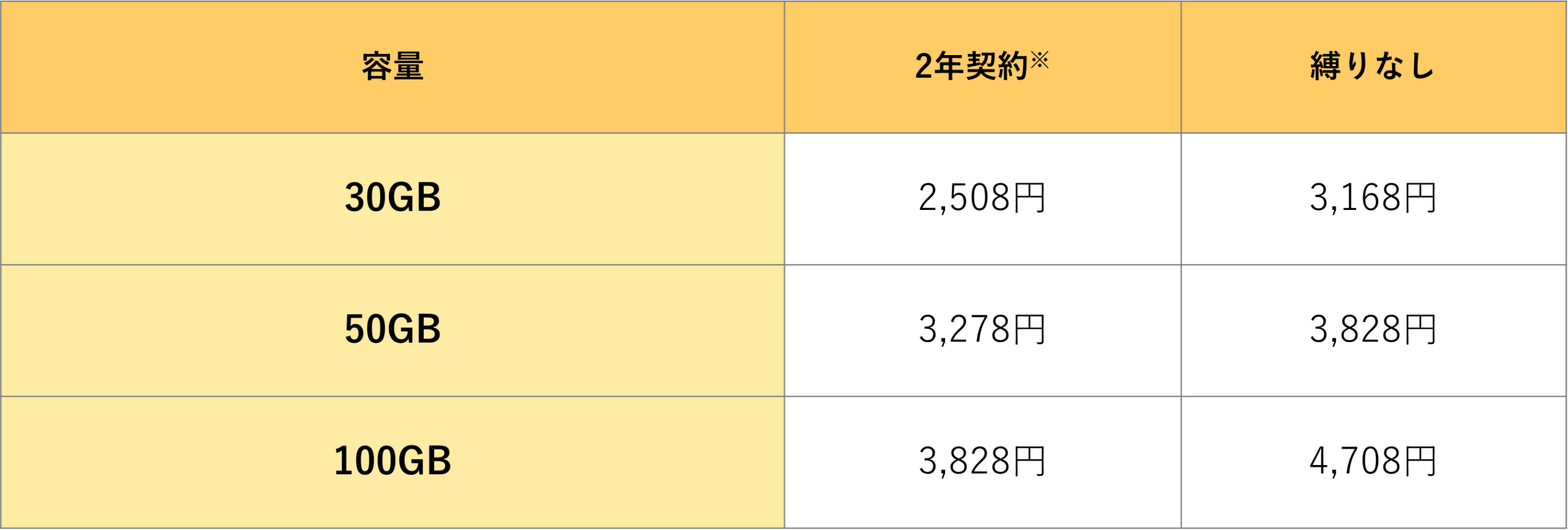 提供プランは30GB/50GB/100GB×2年契約&縛りなしの6種類で、2年契約においては最大で24か月分の月額料金割引が適用される点が特徴です。