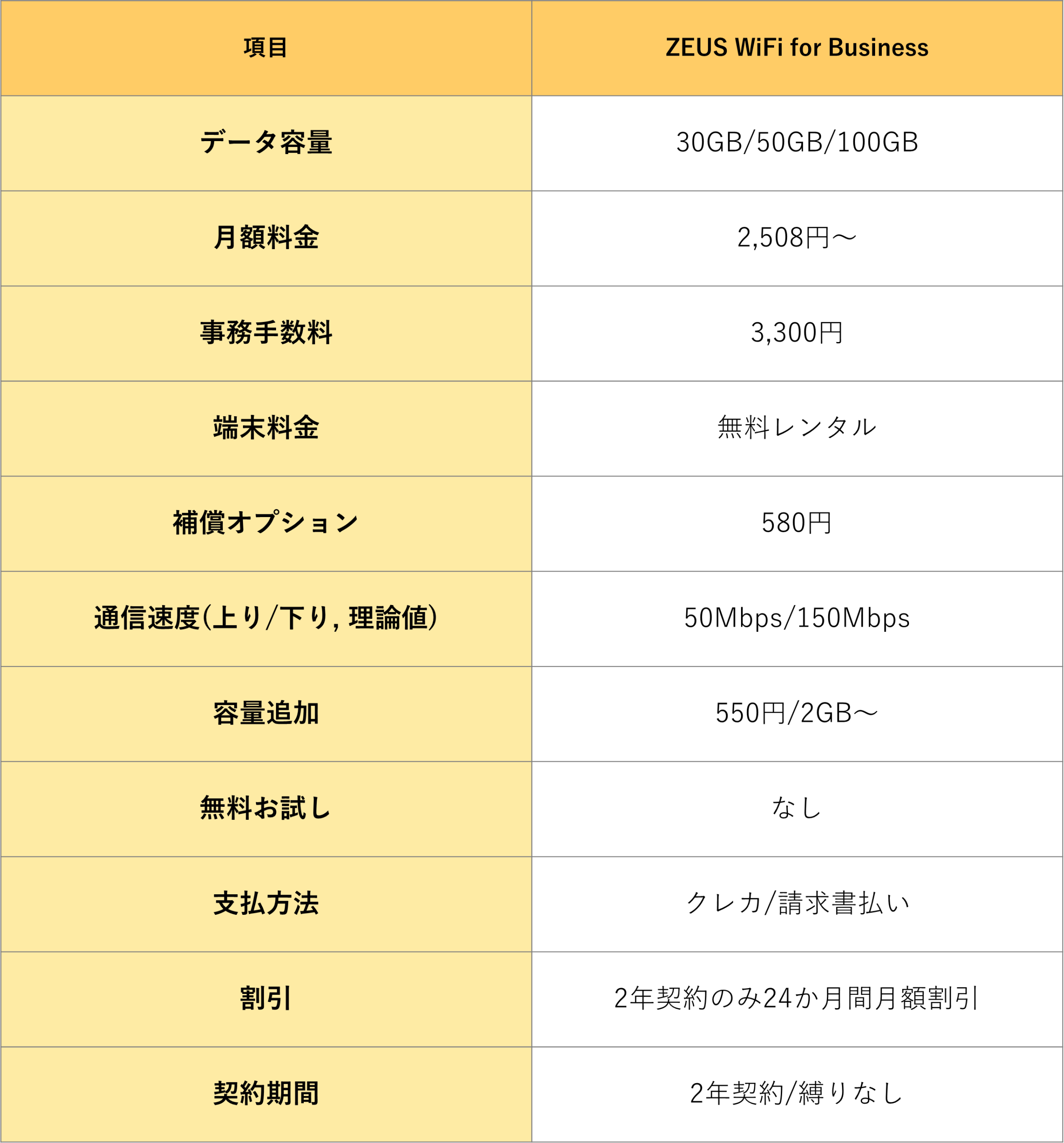 特徴:「ZEUS WiFi for Business」は、月額2,508円から利用可能な法人向けポケット型Wi-Fiです。