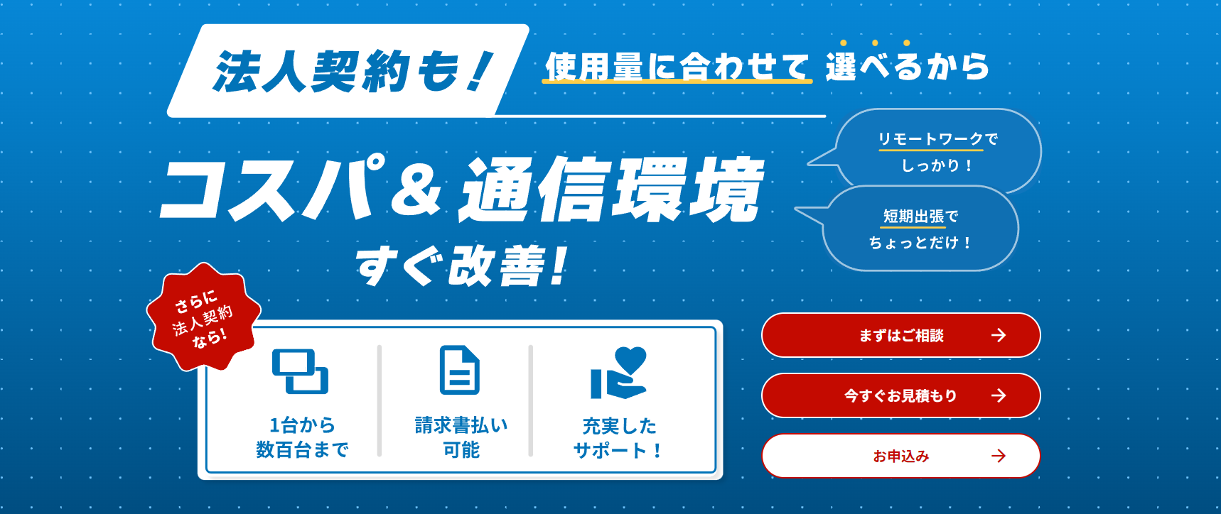 Wi-Fi端末は買い切りで、いつ解約しても契約解除金等はかからないため、サービス利用の先行きが不透明な法人様におすすめのサービスとなっています。