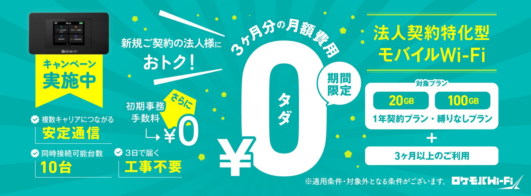また、端末は無料レンタルであることに加え、初期事務手数料&月額3か月分無料キャンペーンも行っていることから、初めてポケット型Wi-Fiを使う法人の方でも安心してご利用の検討を行うことができます。