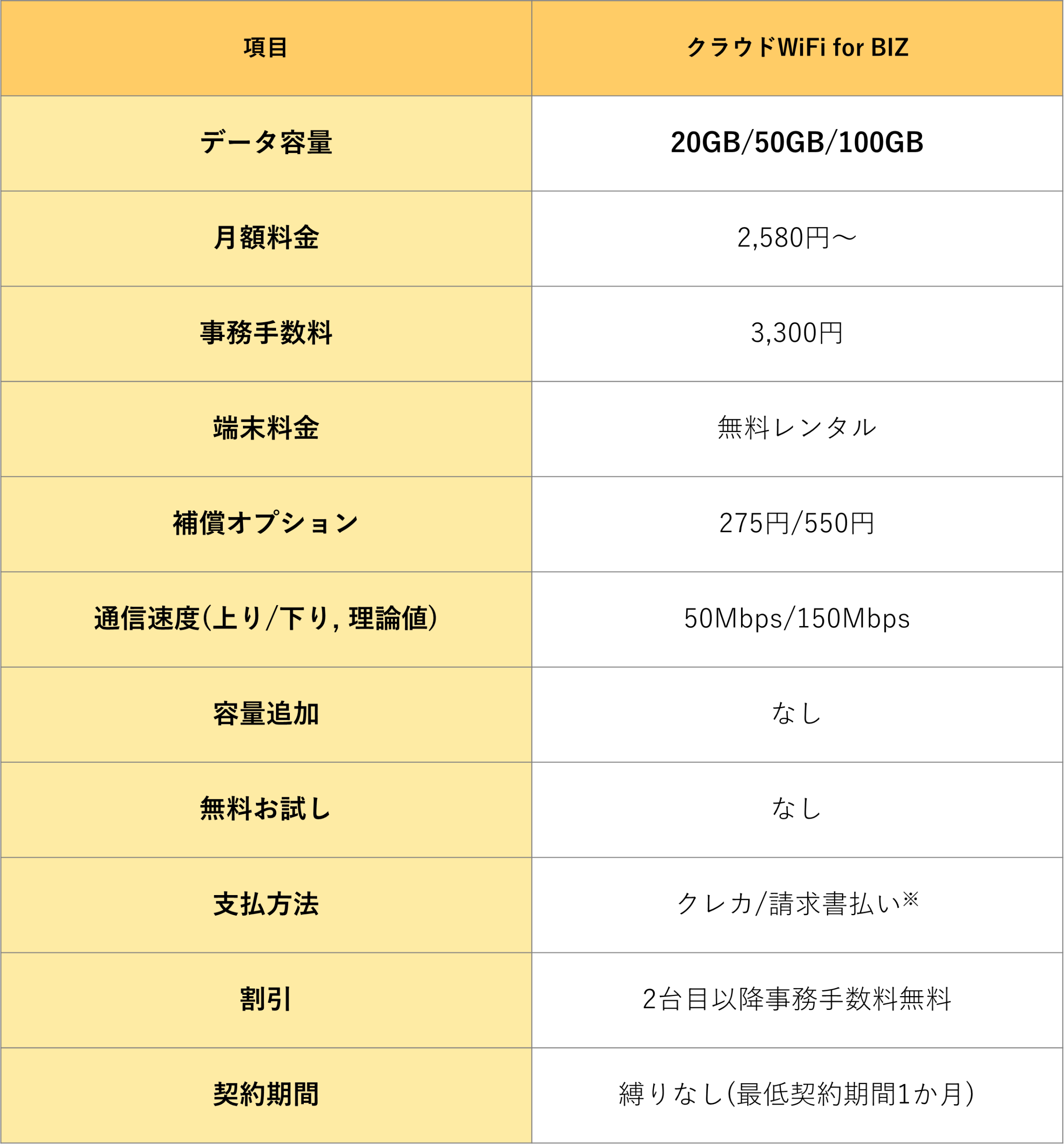 特徴:「クラウドWiFi for BIZ」は月額料金2,580円から利用可能な法人向けポケット型Wi-Fiです。2回線目以降の契約については初期事務手数料3,300円が無料になることに加え、契約期間に縛りがなくいつでも解約可能なことが特徴です。