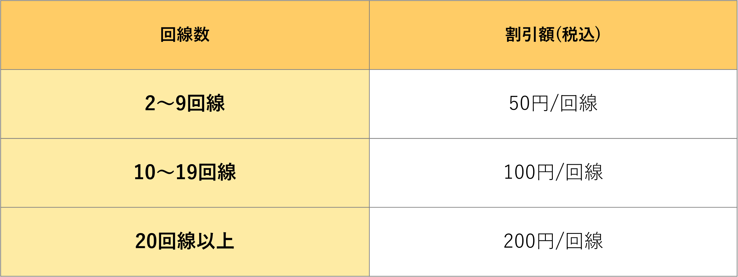 また、大口割引の内訳は以下の通りであり、複数回線の契約を検討している法人様においては、月額費用を大幅に抑えて利用していくことが可能です。