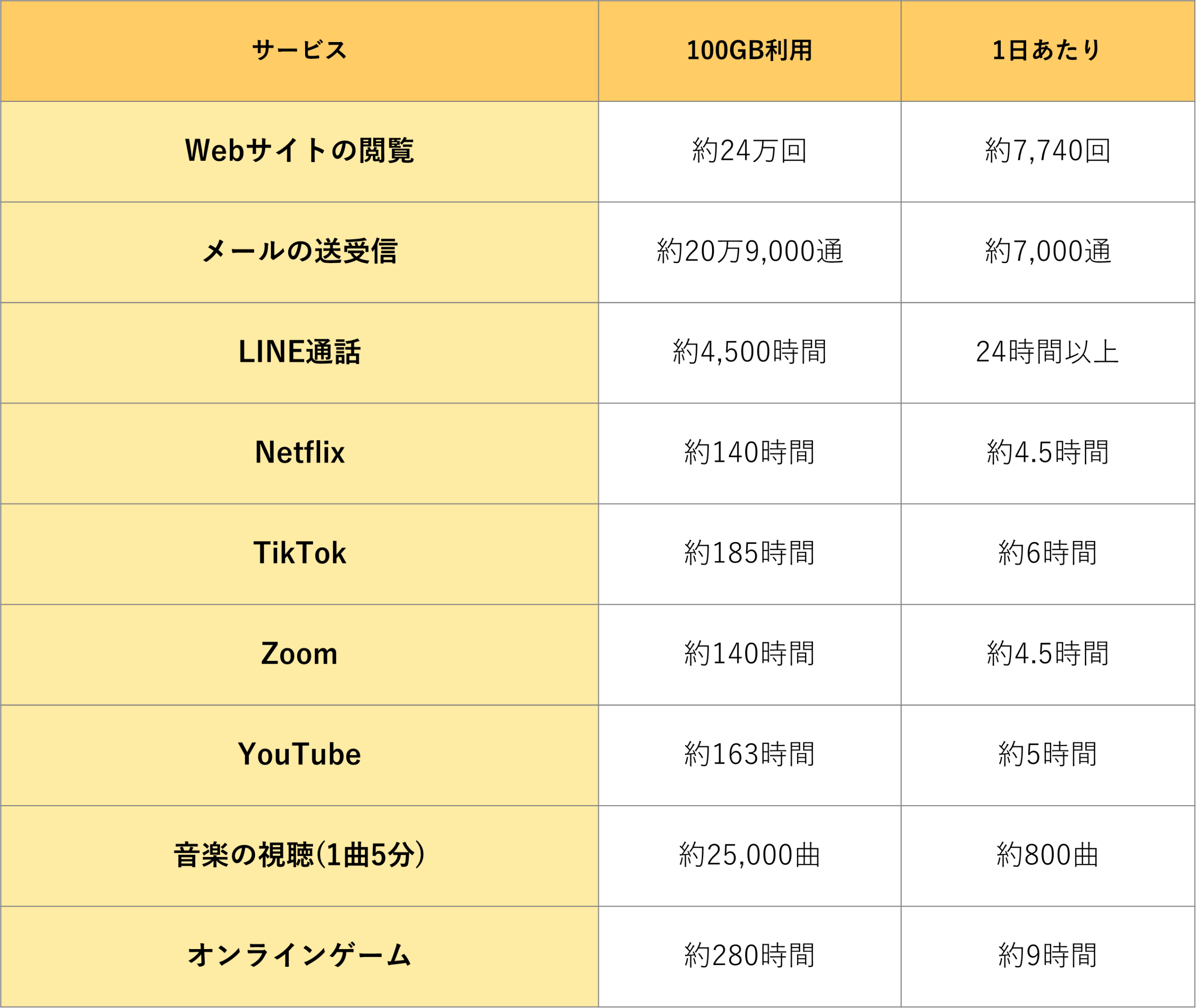 用途によって想定される使用容量の目安は以下の通りで、ほとんどの場合100GB/月のデータ容量が確保されていれば問題ないといえます。