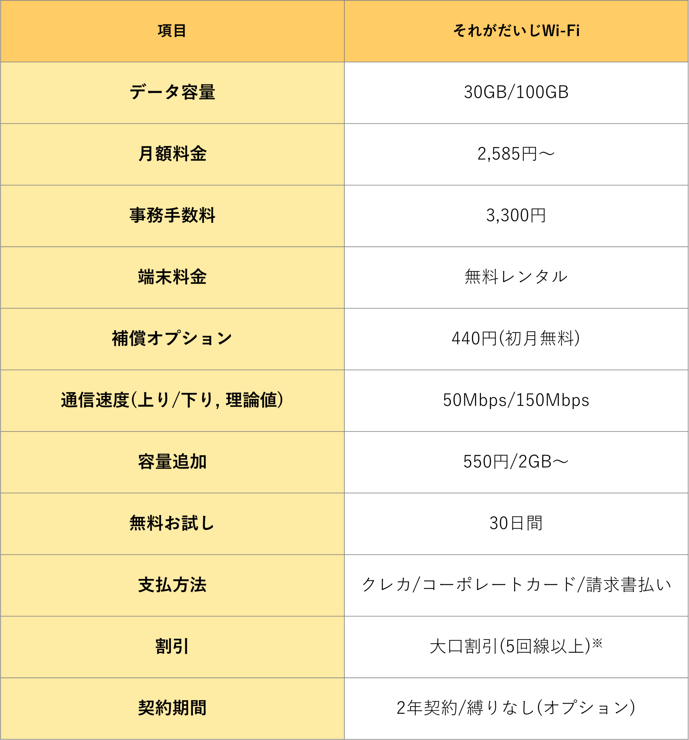 特徴:「それがだいじWi-Fi」は、月額2,585円から利用可能な法人向けポケット型Wi-Fiサービスです。30GB&100GB×2年契約&縛りなしを組み合わせた、合計4種類のプランを提供しており、利用用途に合わせたプラン選択が可能です。