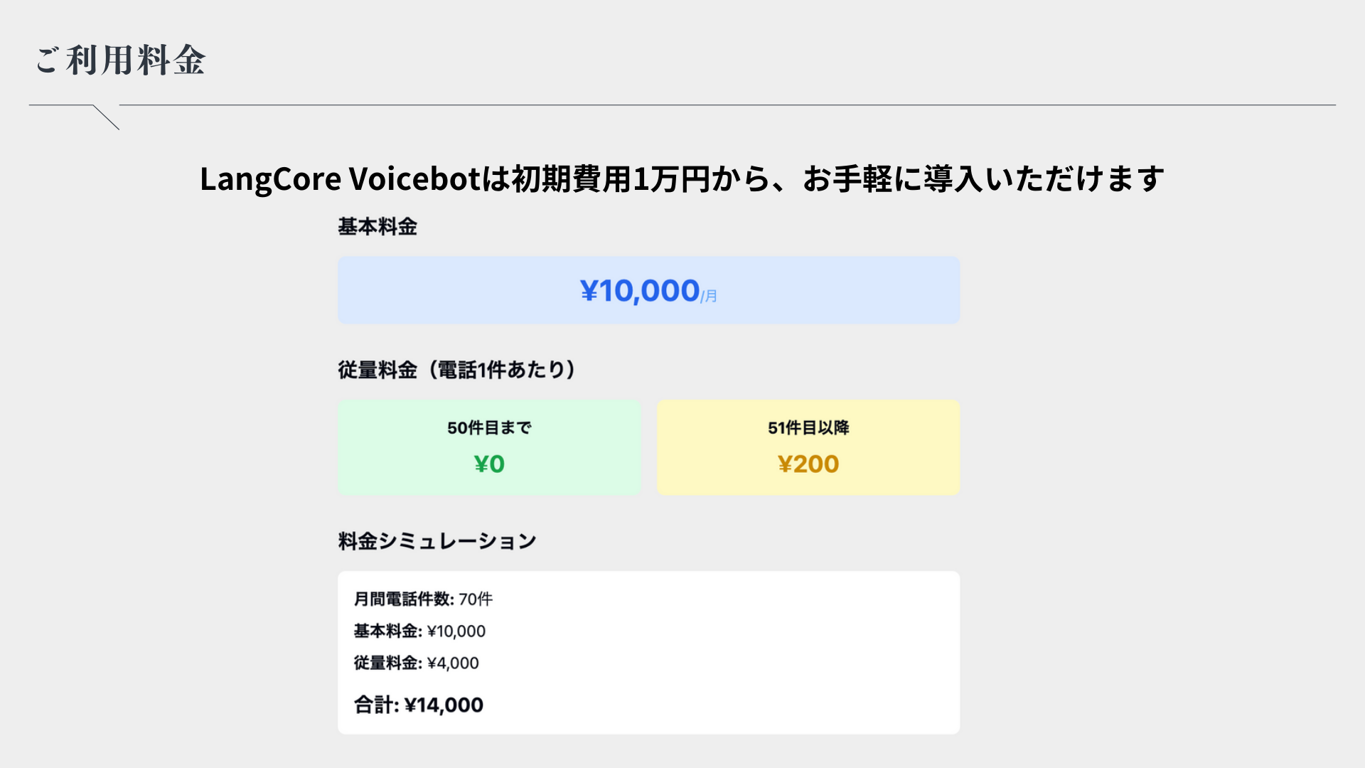 LangCoreボイスボットは、コンタクトセンターでの電話対応業務をAIに代替する音声AIシステムです。