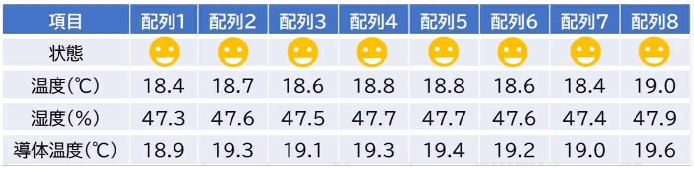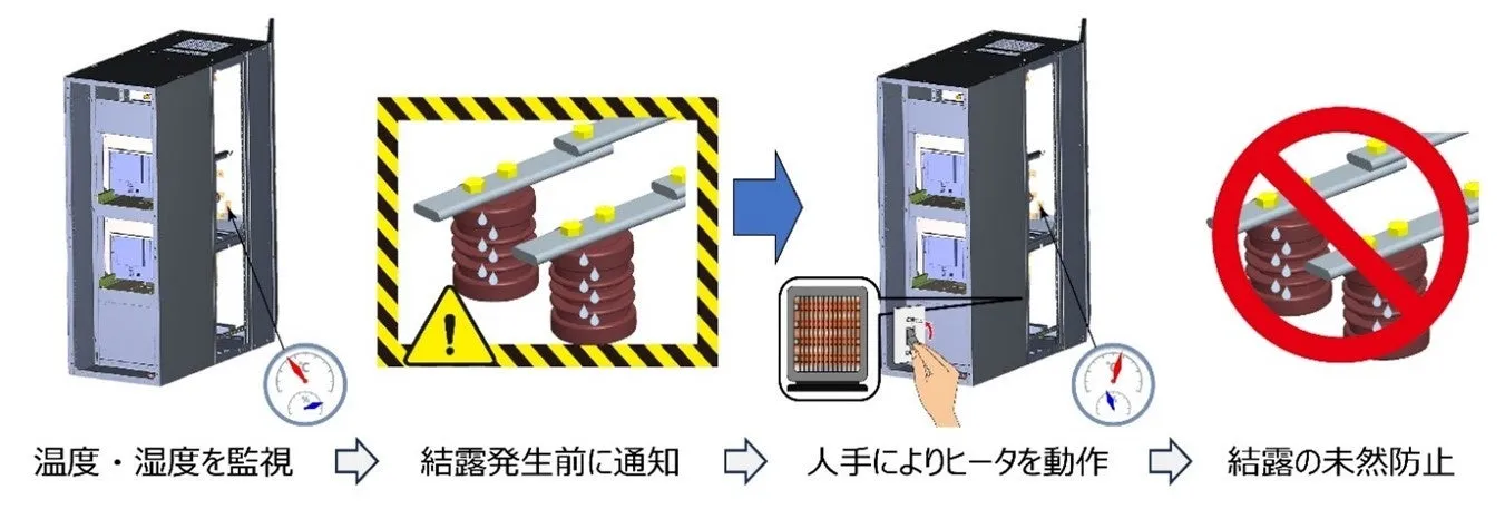 設備内外の湿度や温度を監視し、異常が予想される場合に早期対応を実施。例えば、湿度が高い環境で結露が予想される場合、センサで確認し結露のリスクがある際に通知、ヒーターや除湿器を起動させて事前防止します。