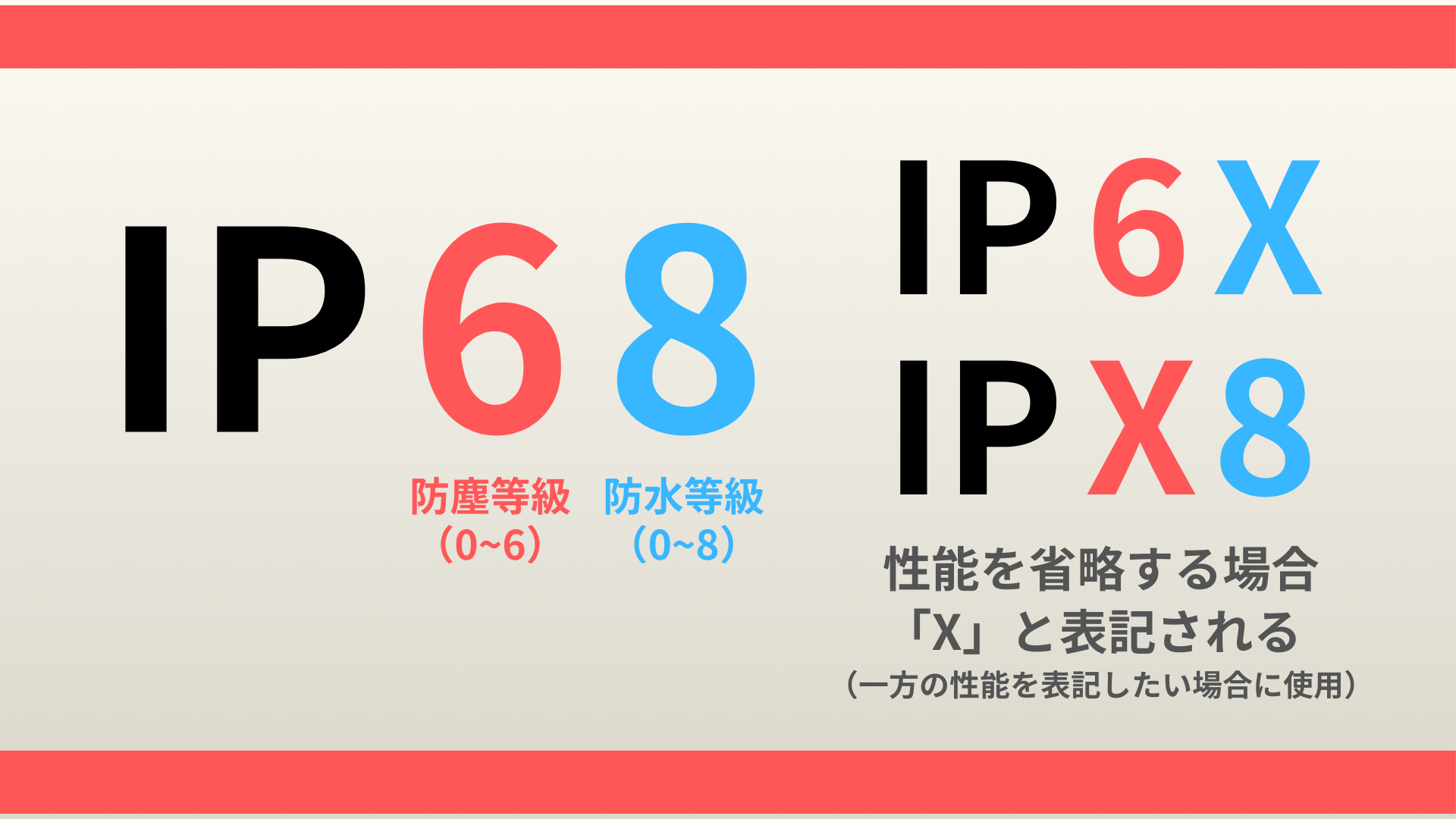 防水・防塵性能の基準としてIP規格を確認すると良いでしょう。カメラのIP規格はIP00〜68までの2桁番号が割り振られており、十の位が防塵等級(0〜6)、一の位が防水等級(0〜8)を表します。性能は等級の数字が大きいほど高く、野外で運用するカメラならば、完全な防塵性能と強い水流に耐える防水性能を表すIP66以上が望ましいとされています。