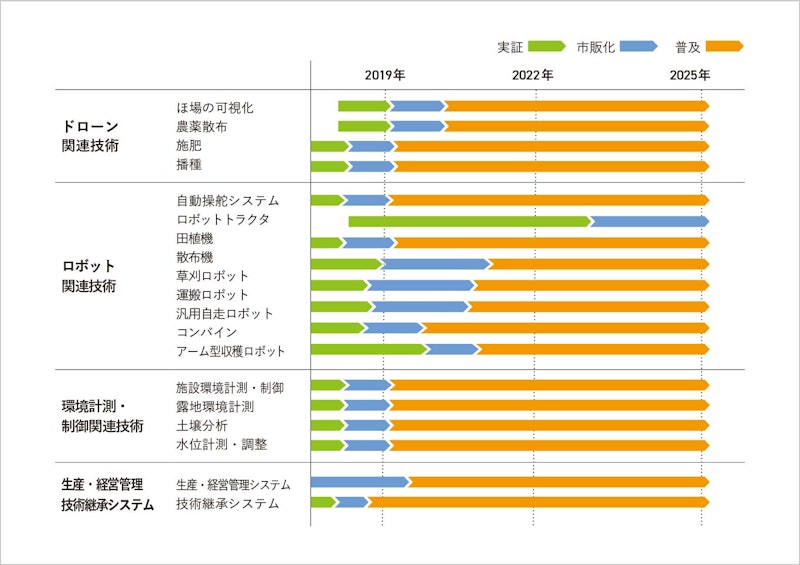 スマート農業と各技術の普及という観点から、2019年の6月に農林水産省が発表した「農業新技術の現場実装推進プログラム」によると、下記のような普及ロードマップがあります。