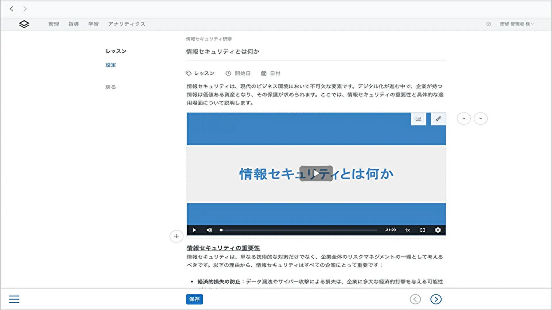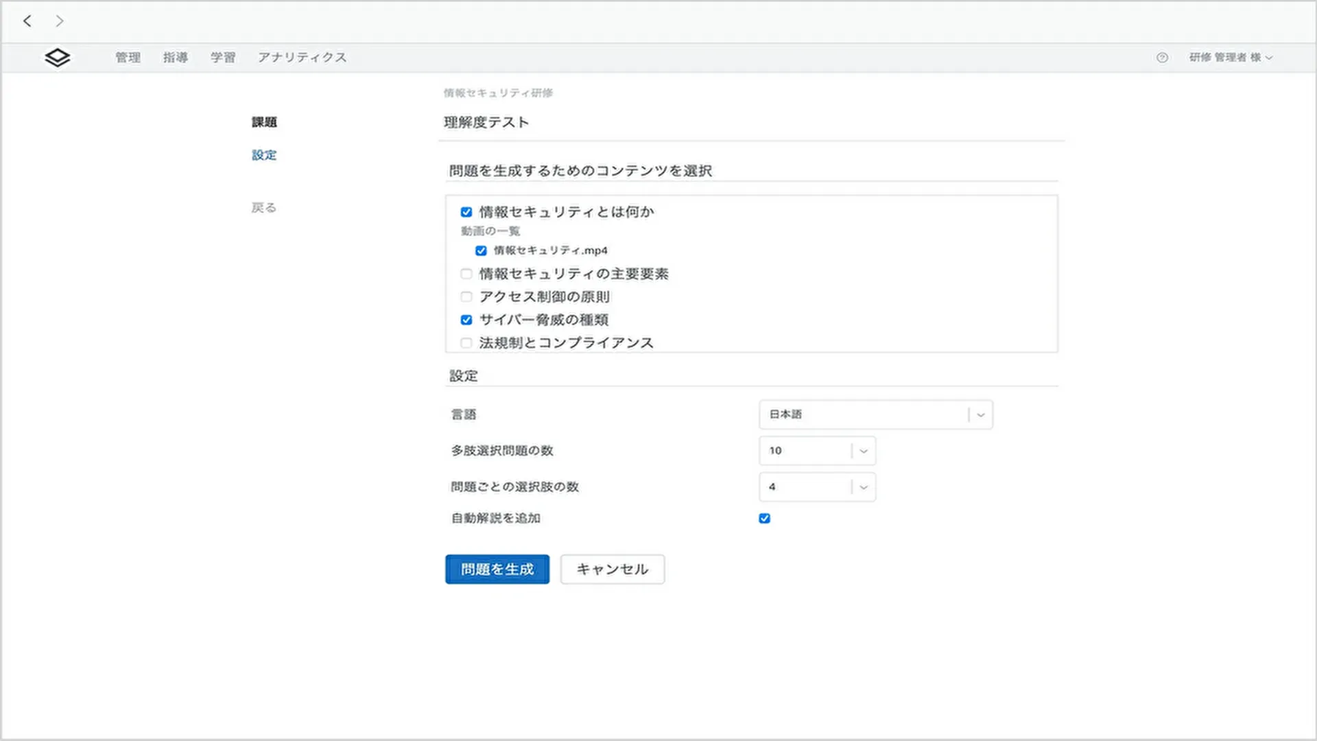 Coursebaseの新AI機能は、アップロードされた学習コンテンツ(動画、PDF、PowerPoint、Word、画像、音声など)をAIが解析し、コンテンツの内容に基づく問題、解答、解説を自動生成するものです。たとえば、情報セキュリティの30分の動画から10問の問題と4つの選択肢、解説が自動的に生成されます。従来のように担当者が問題作成のために内容を確認したり、手作業で入力する必要がなく、品質の確認や改善にかかる時間が大幅に削減されます。