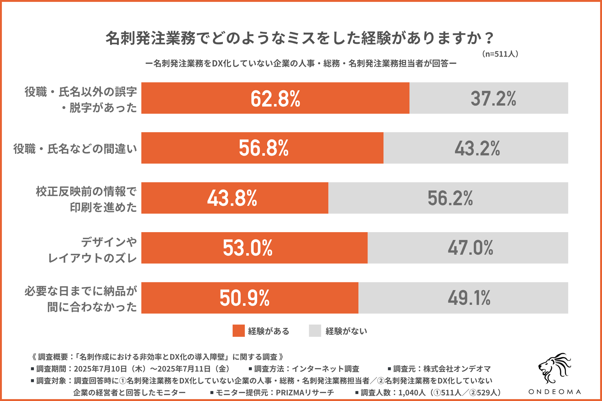 しかし、名刺発注業務のDX化はあまり進んでいない様です。これに対し株式会社オンデオマは、現場と経営者の温度感の差に問題があるのではないかという仮説を元に調査を実施しました。