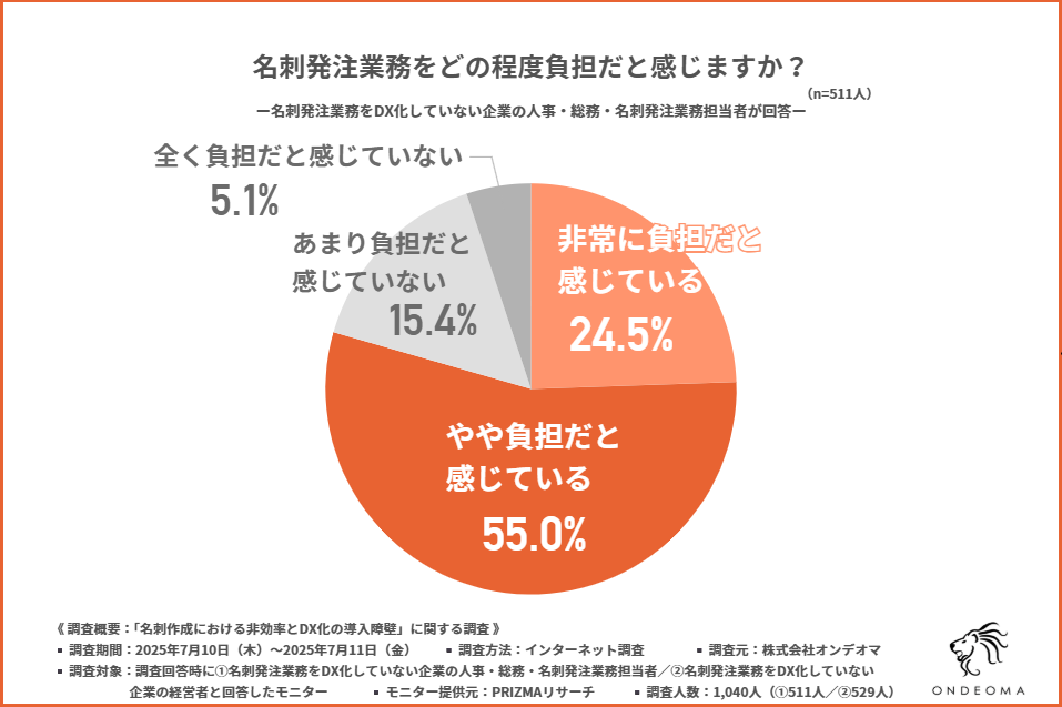「名刺発注業務に対する負担の程度」の調査では、「非常に負担だと感じている」との回答が24.5%、「やや負担だと感じている」との回答が55.0%となり、8割近くの担当者が負担を感じている結果となっています。