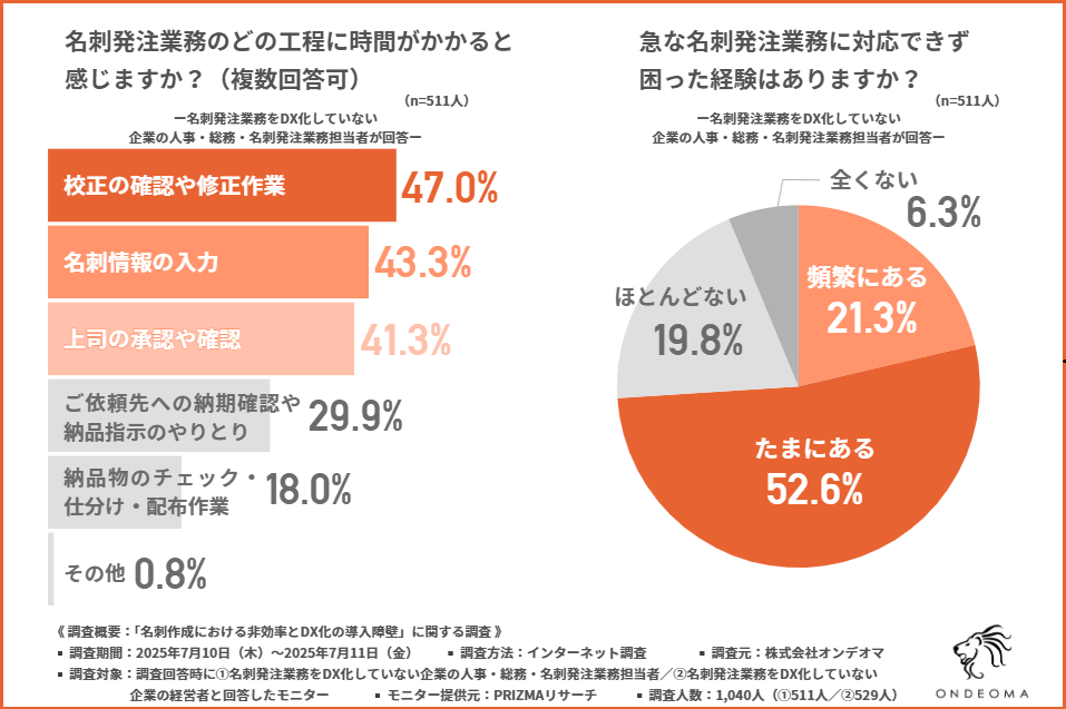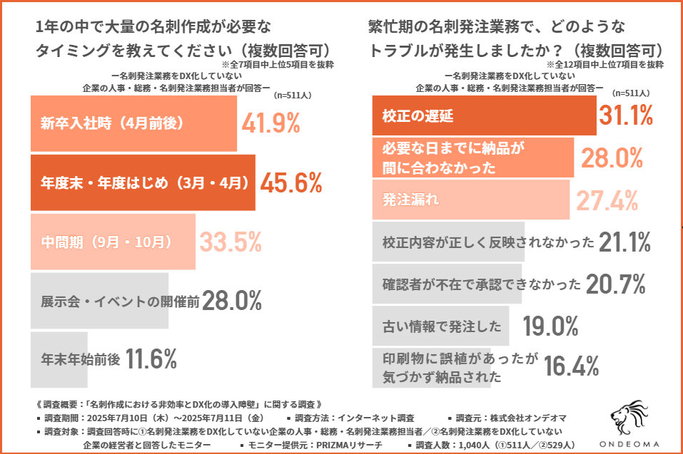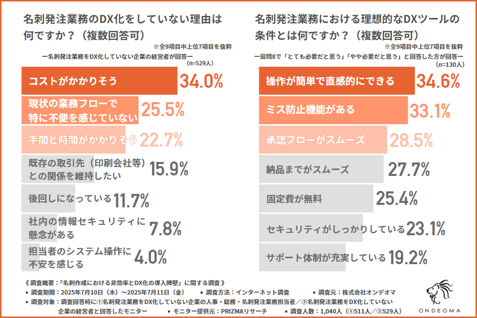 株式会社オンデオマが、名刺発注業務をDX化していない企業の①人事総務などの担当者と②経営者のそれぞれを対象に、「名刺作成における非効率とDX化の導入障壁」に関する調査を実施しました。